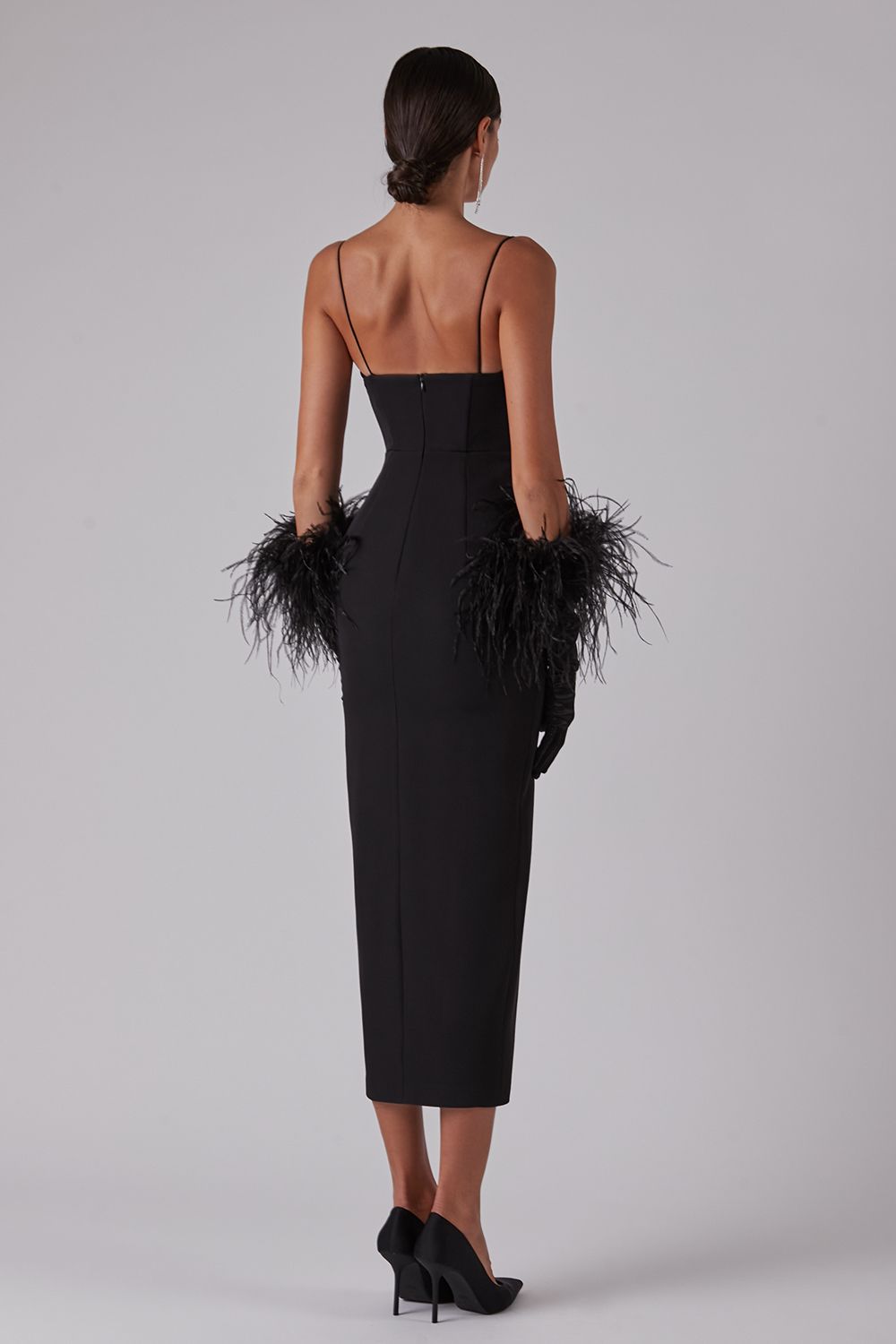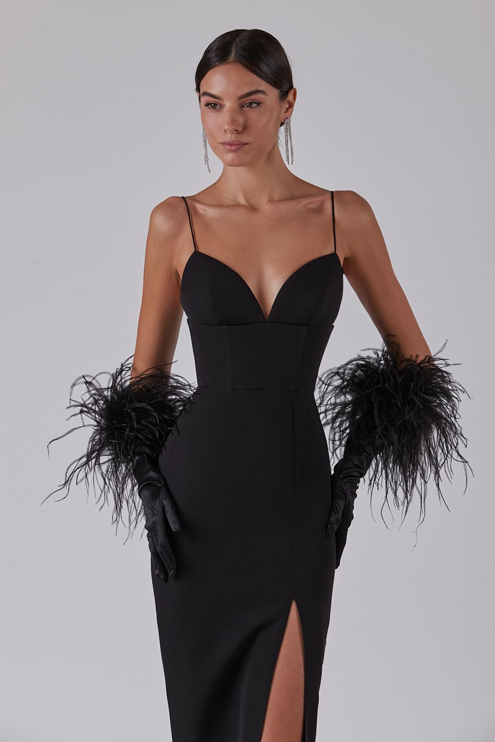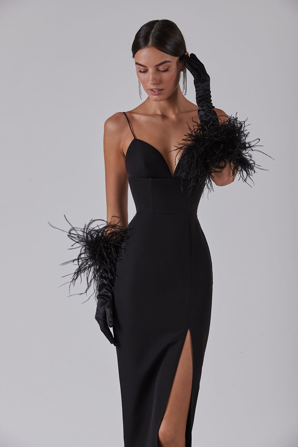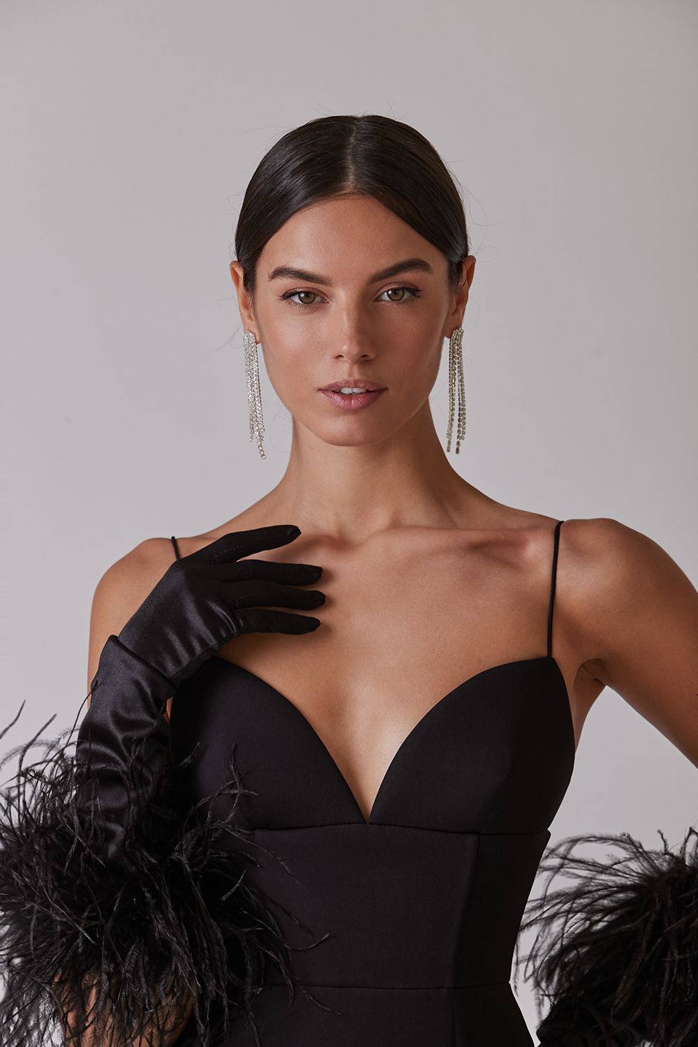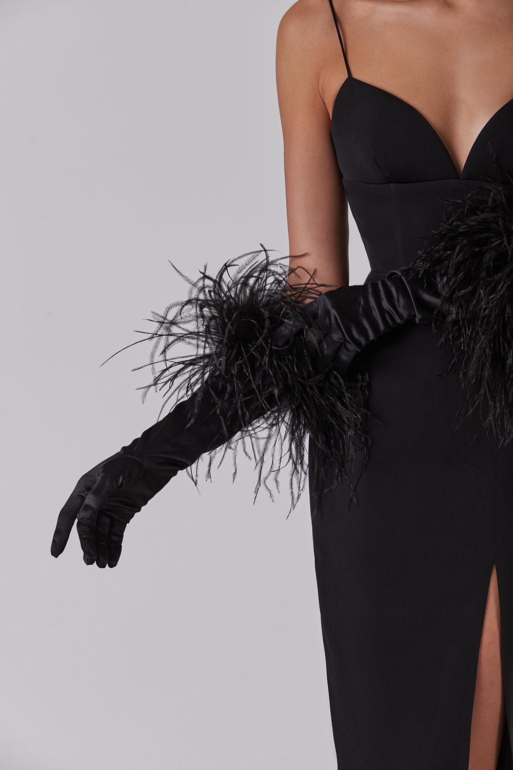 Высокие перчатки, украшенные перьями страуса. Состав: 97% полиэстер, 3% лайкра