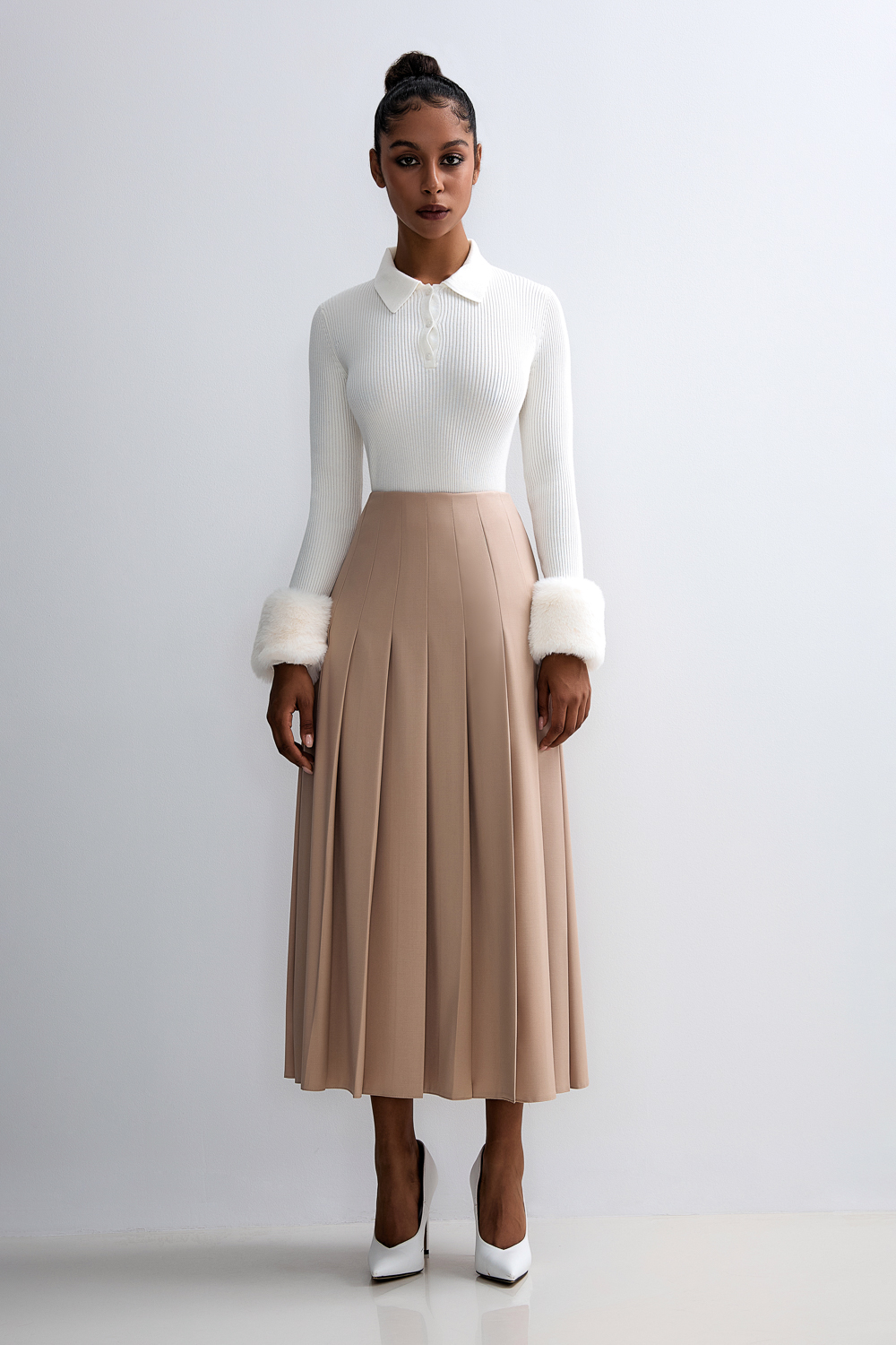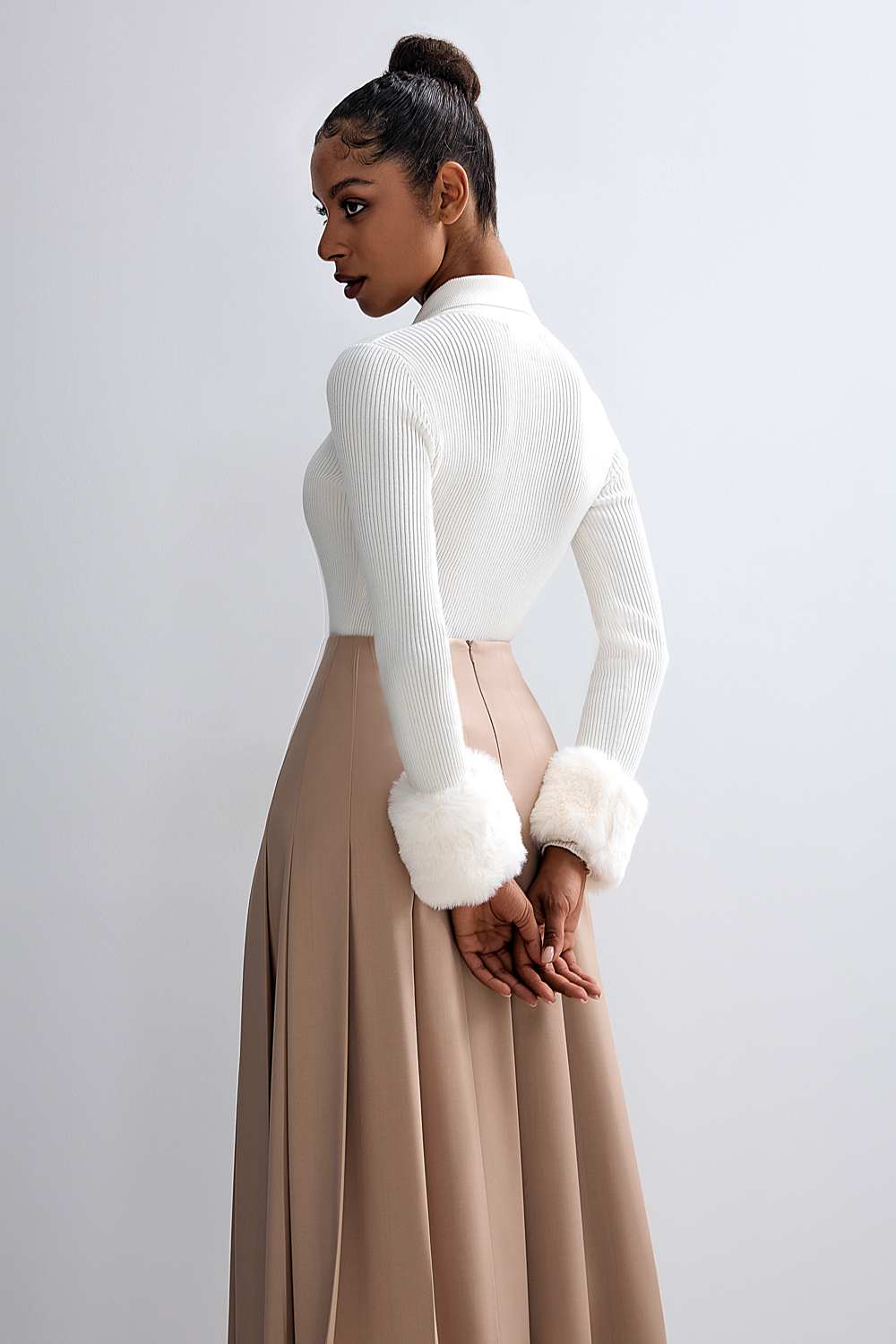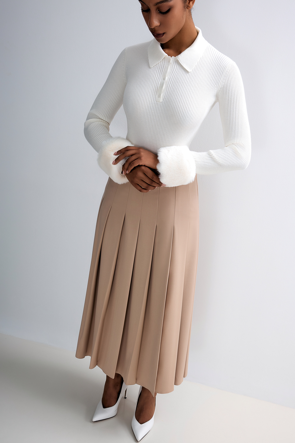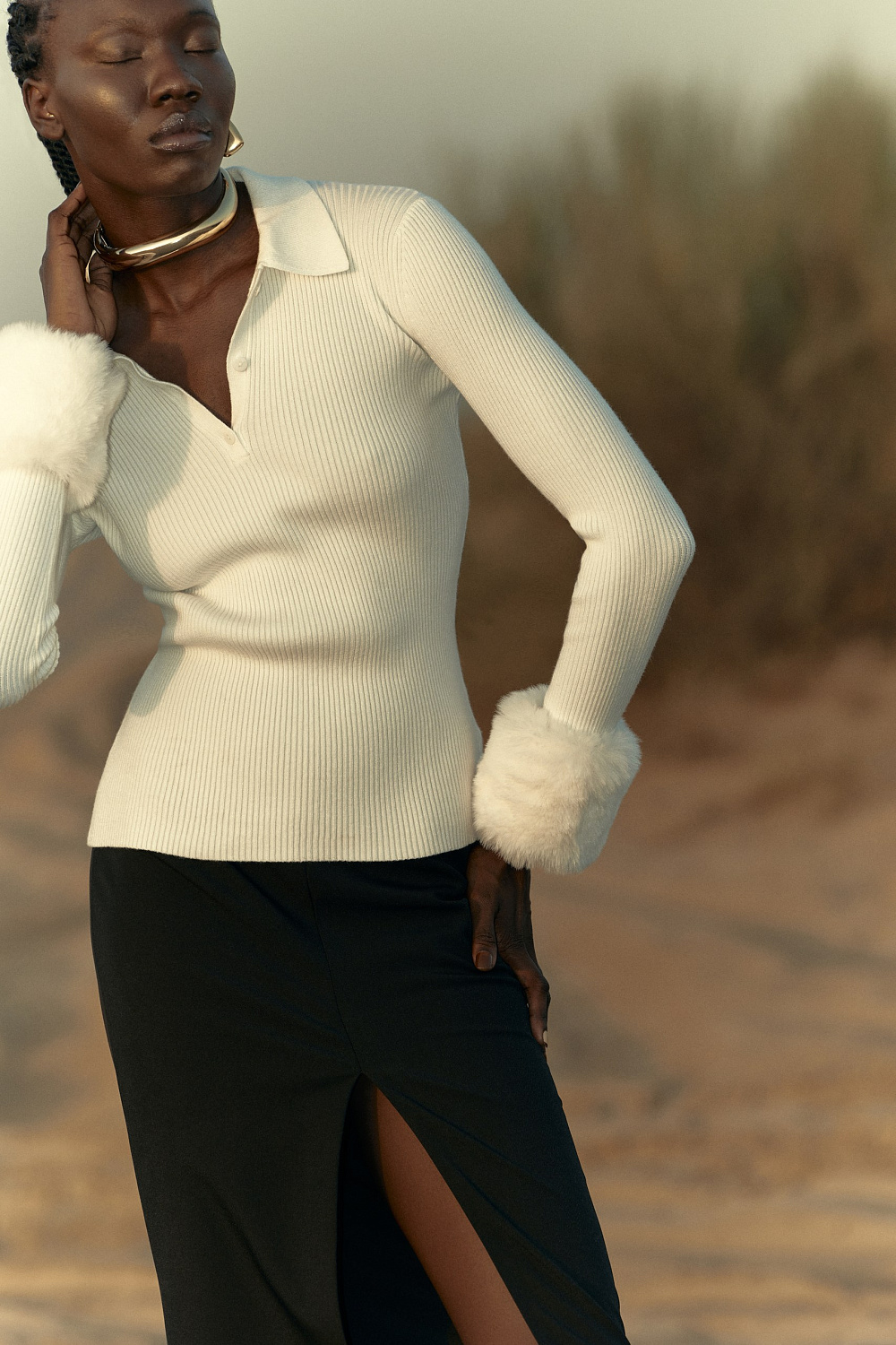 Трикотажная кофта поло в рубчик на пуговицах. Длинный рукав украшен искусственным мехом. Мех на рукавах — съемный. Длина по спинке 56 см, длина рукава 59 см. Состав: 45% вискоза, 29% полиэстер, 17% нейлон, 9% шерсть.