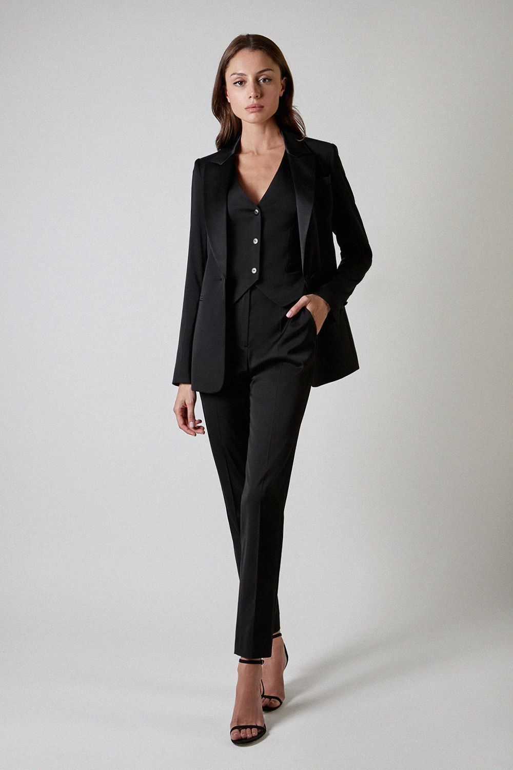 Классические rостюмные брюки с высокой посадкой и заутюженными стрелками. Длина от талии по внешнему шву 102 см. Состав: 63% вискоза, 32% полиэстер, 5% эластан.