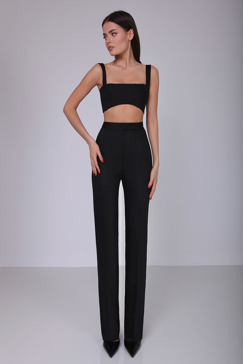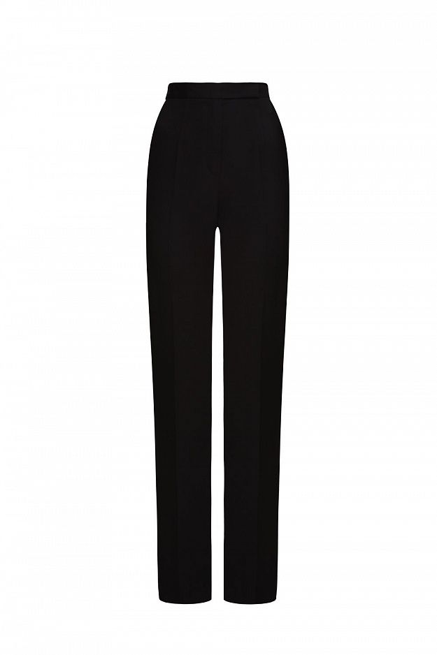 Брюки прямого кроя с завышенной талией и стрелками. На талии эластичные вставки для более плотной и удобной посадки. Состав: 63% вискоза, 32% полиэстер, 5% эластан.