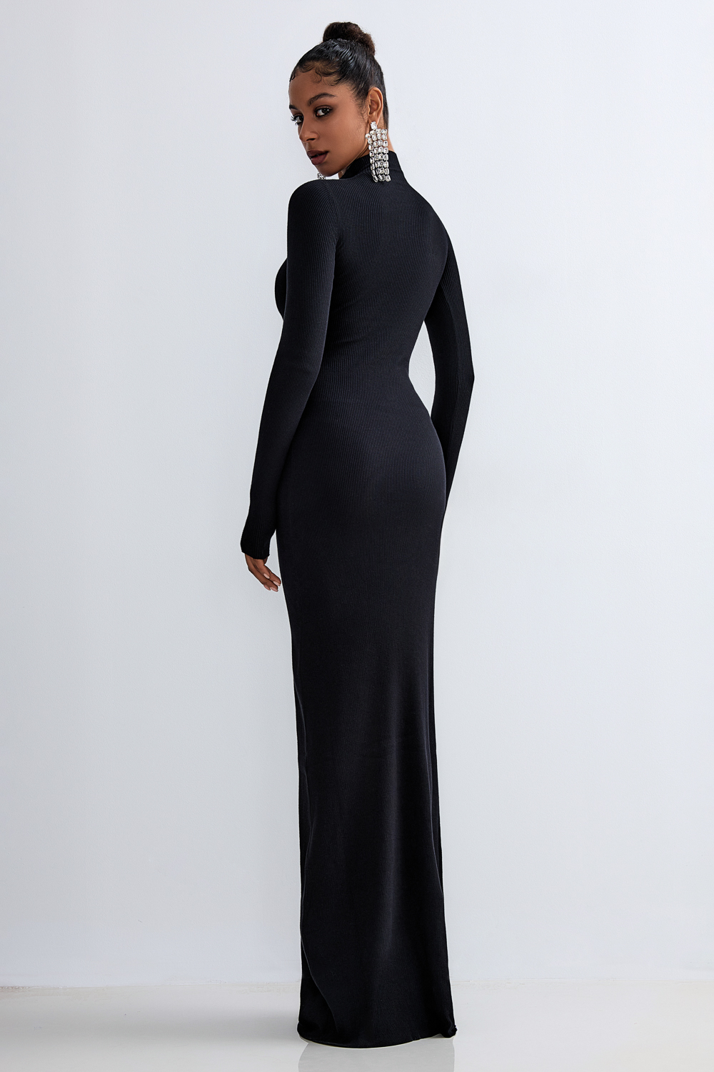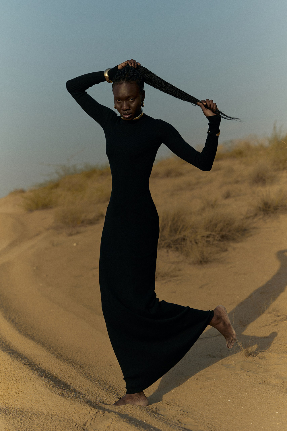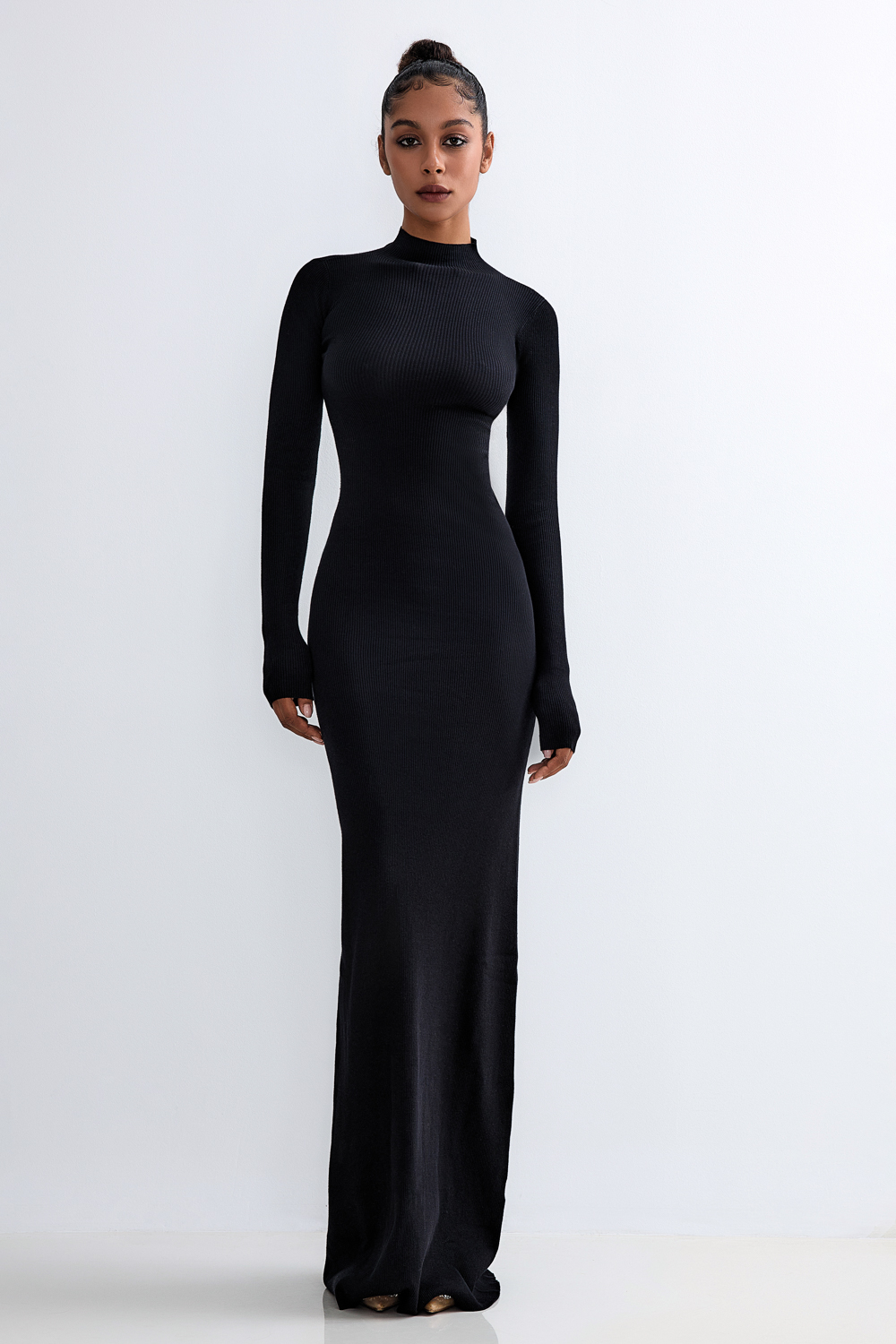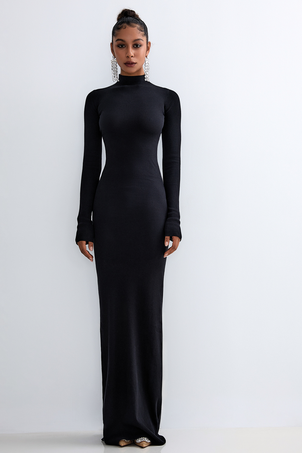Удлиненное платье, выполненное из вязаного трикотажа. Пряжа с фактурной поверхностью в рубчик. Длина по спинке 160 см, длина рукава 69 см. Состав: 80% хлопок, 20% полиамид.