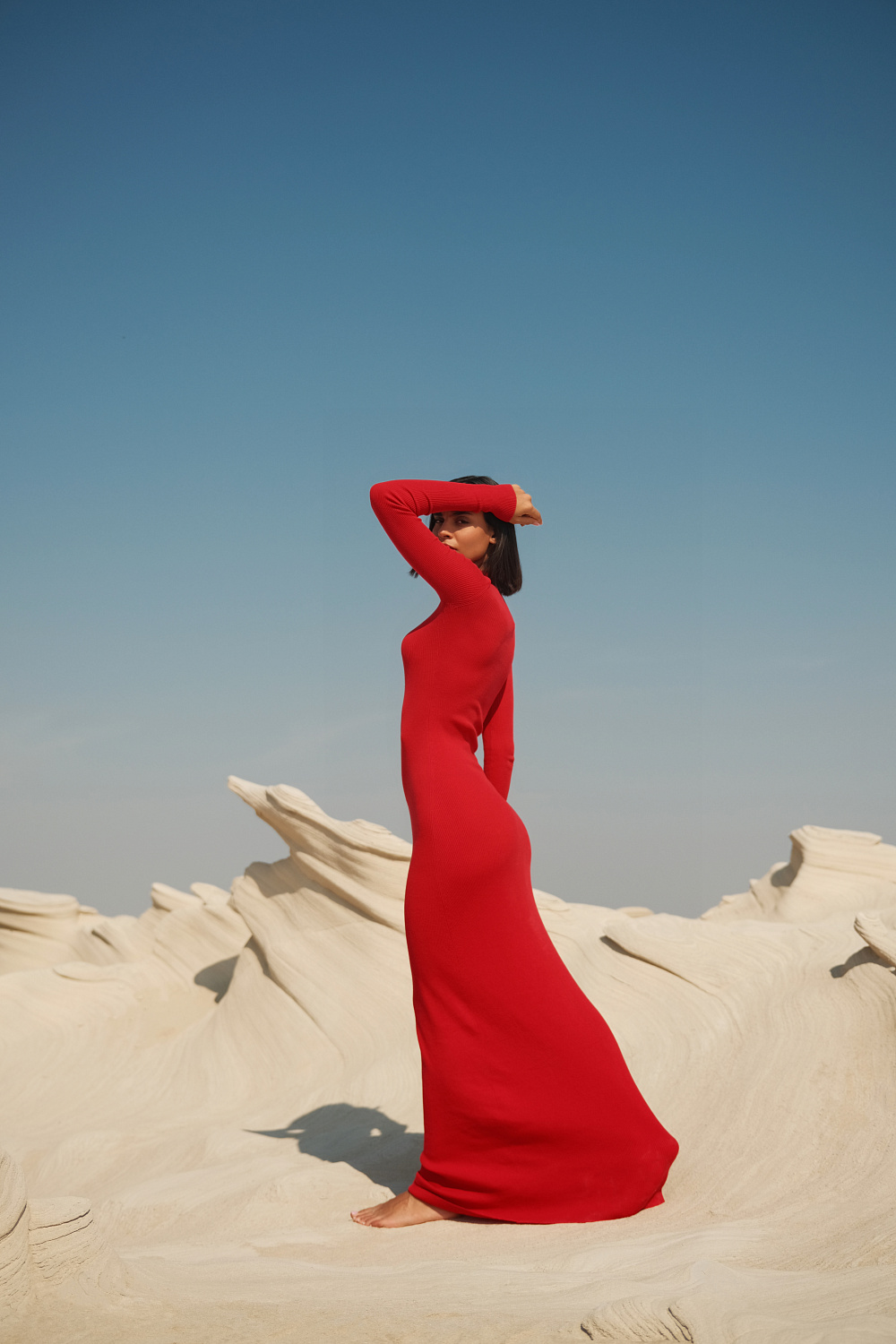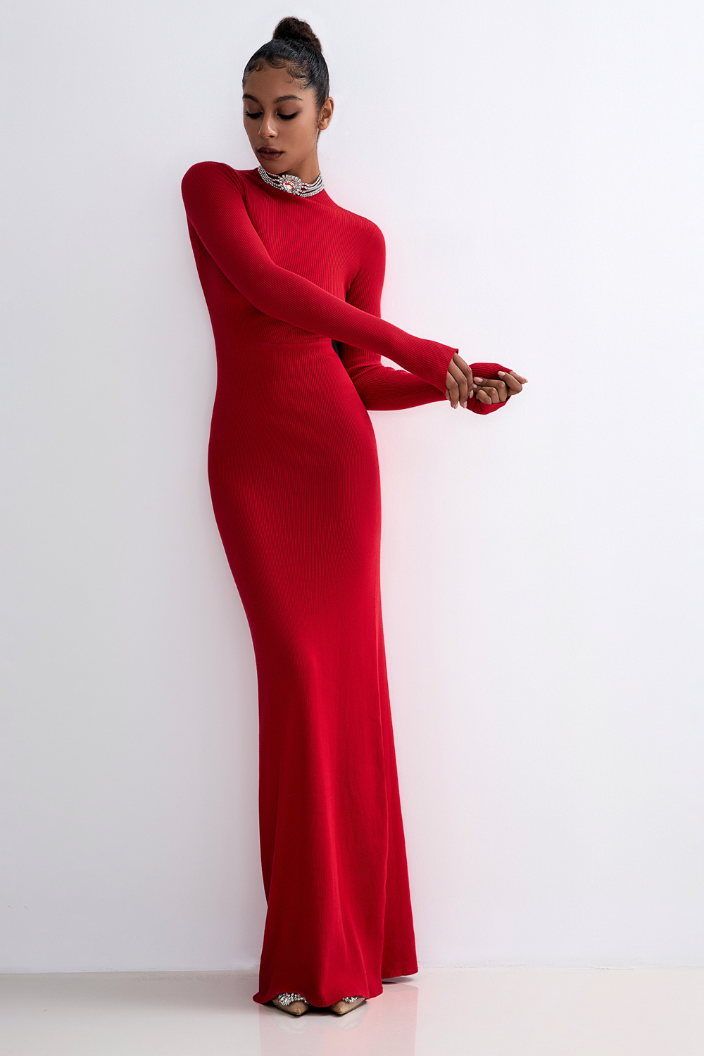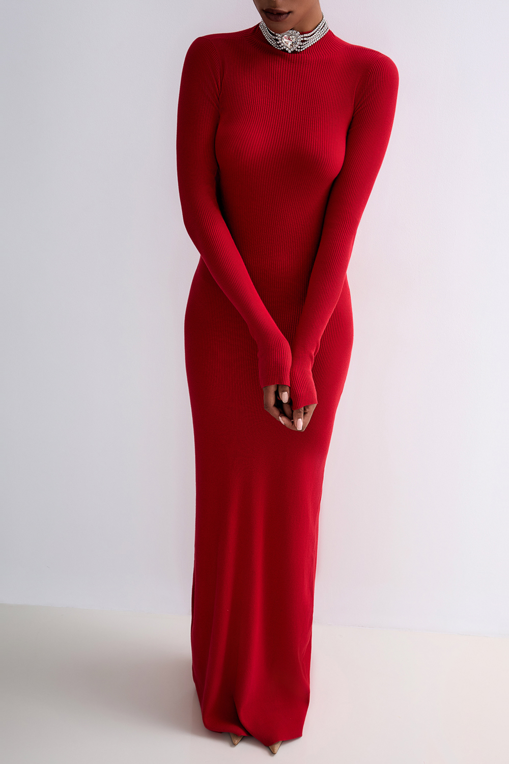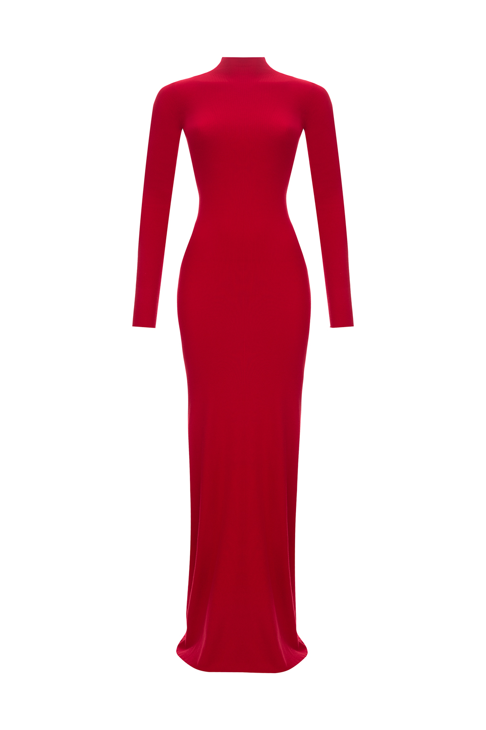 Удлиненное платье, выполненное из вязаного трикотажа. Пряжа с фактурной поверхностью в рубчик. Длина по спинке 160 см, длина рукава 69 см. Состав: 80% хлопок, 20% полиамид.