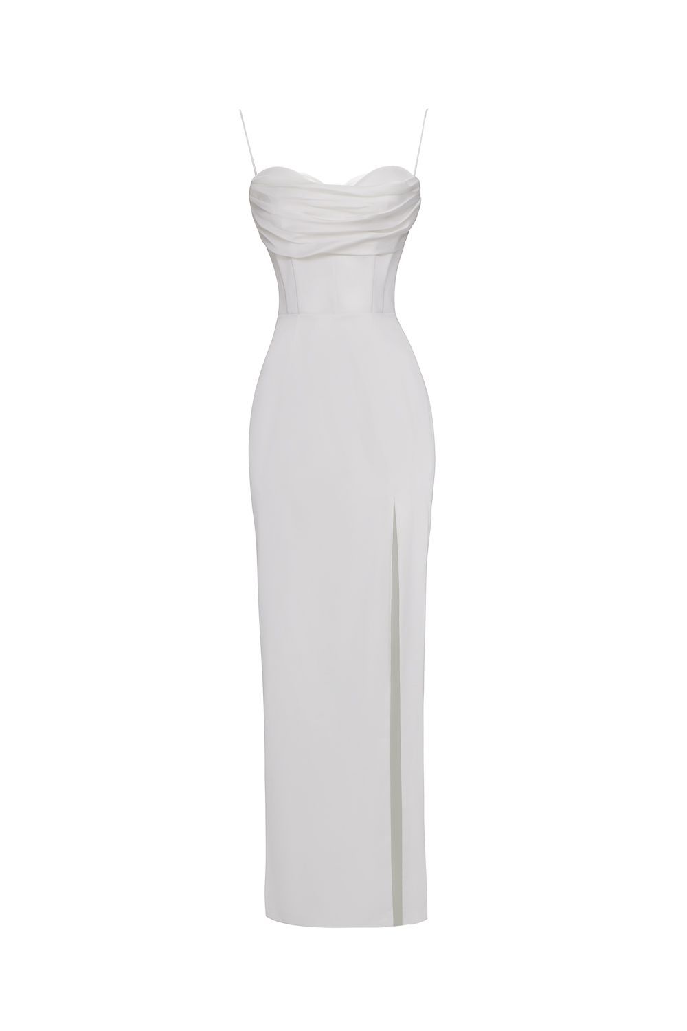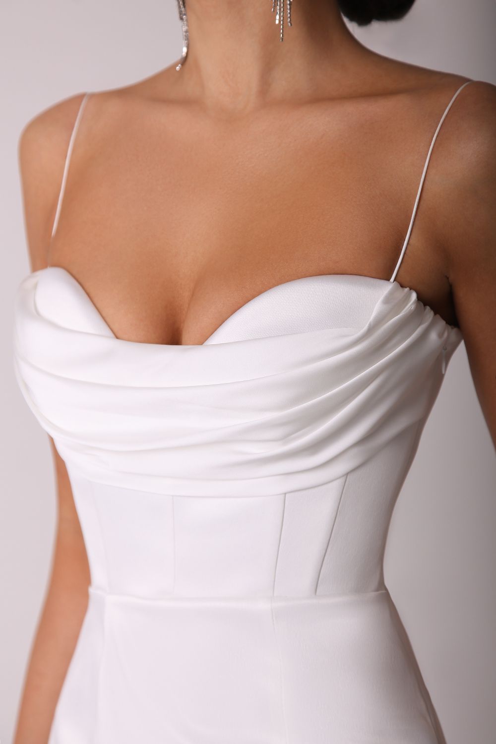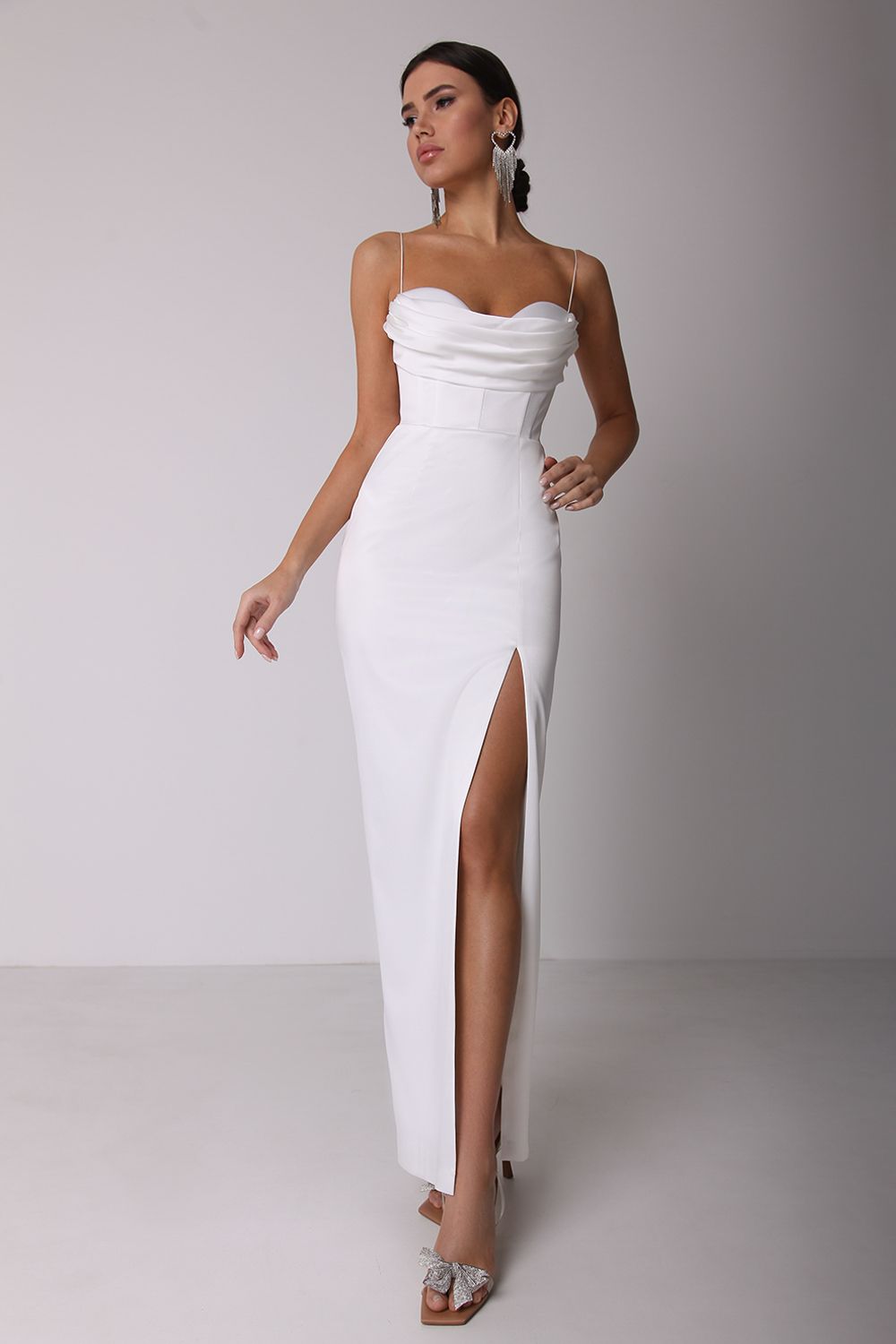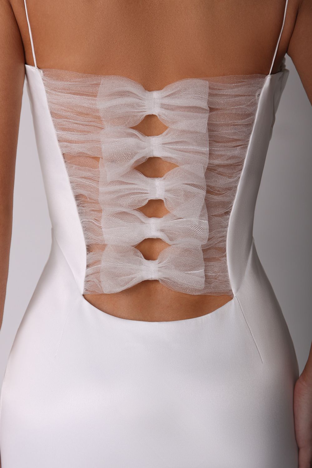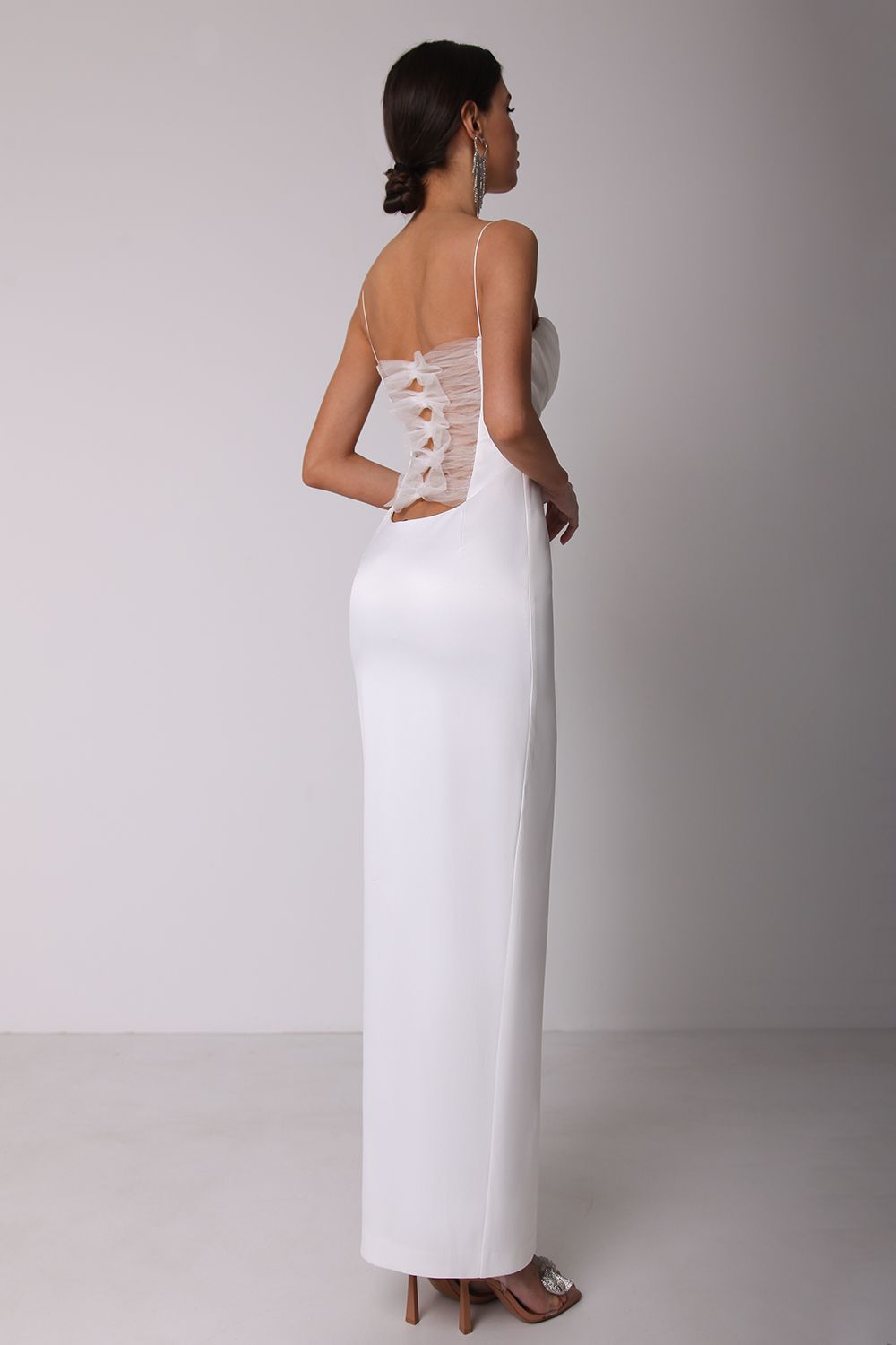 Облегающее платье макси на тонких бретелях с притягательным вырезом на спине, украшенным шифоновыми бантиками. Длина по боковому шву 120 см. Состав: 63% полиэстер, 37% вискоза, Подкладка 95% полиэстер, 5% эластан.