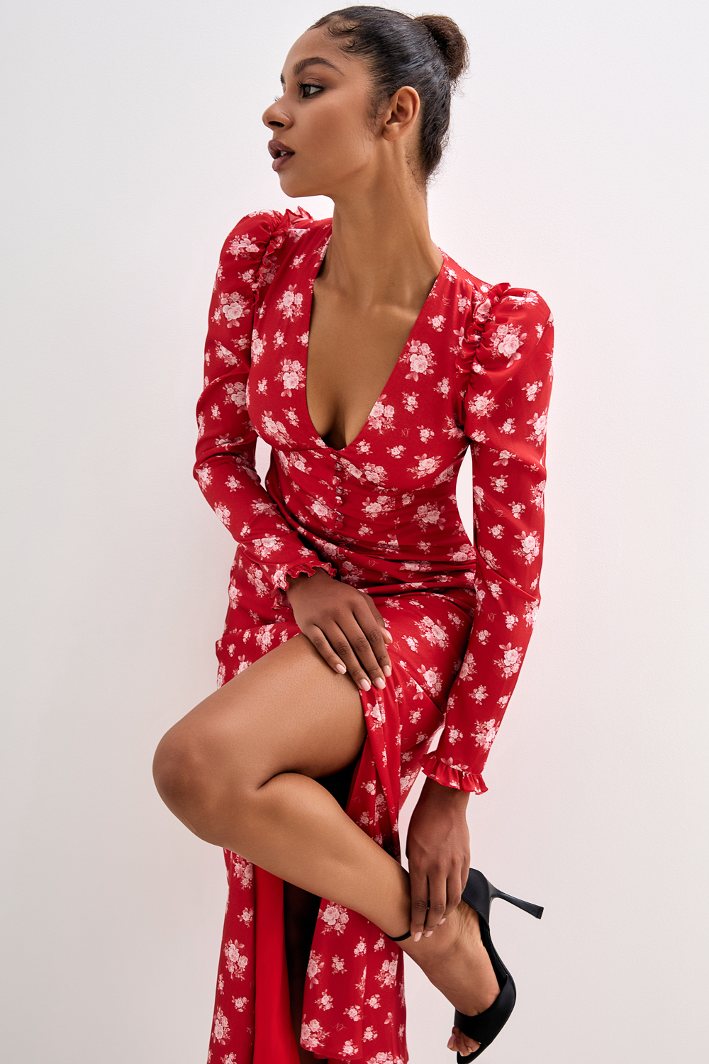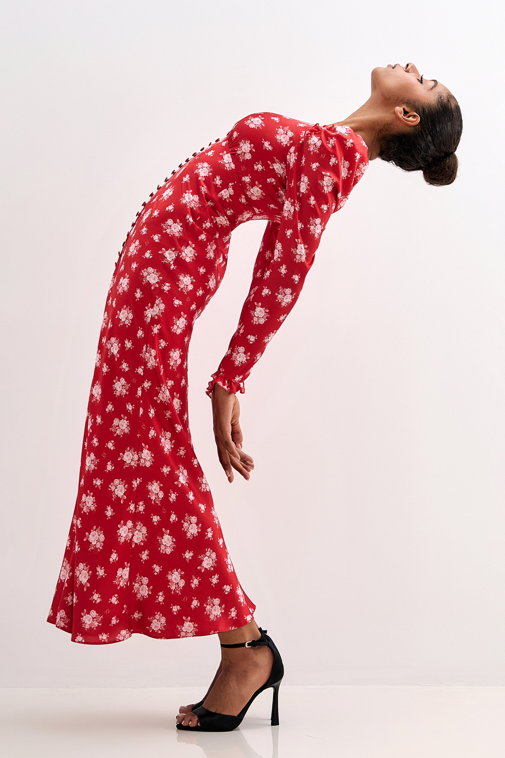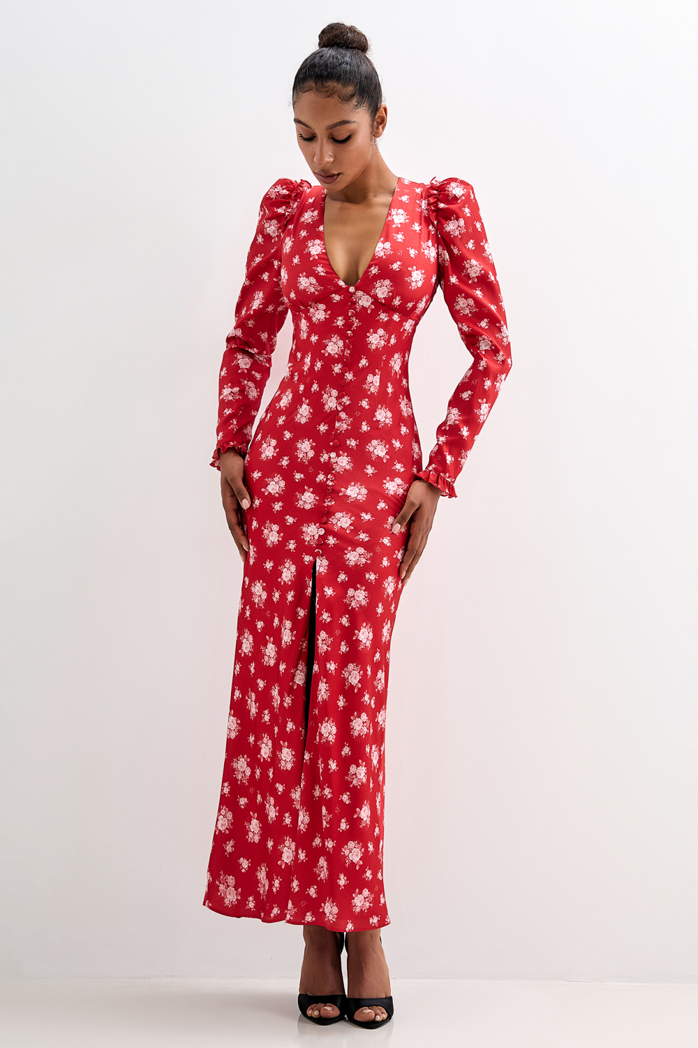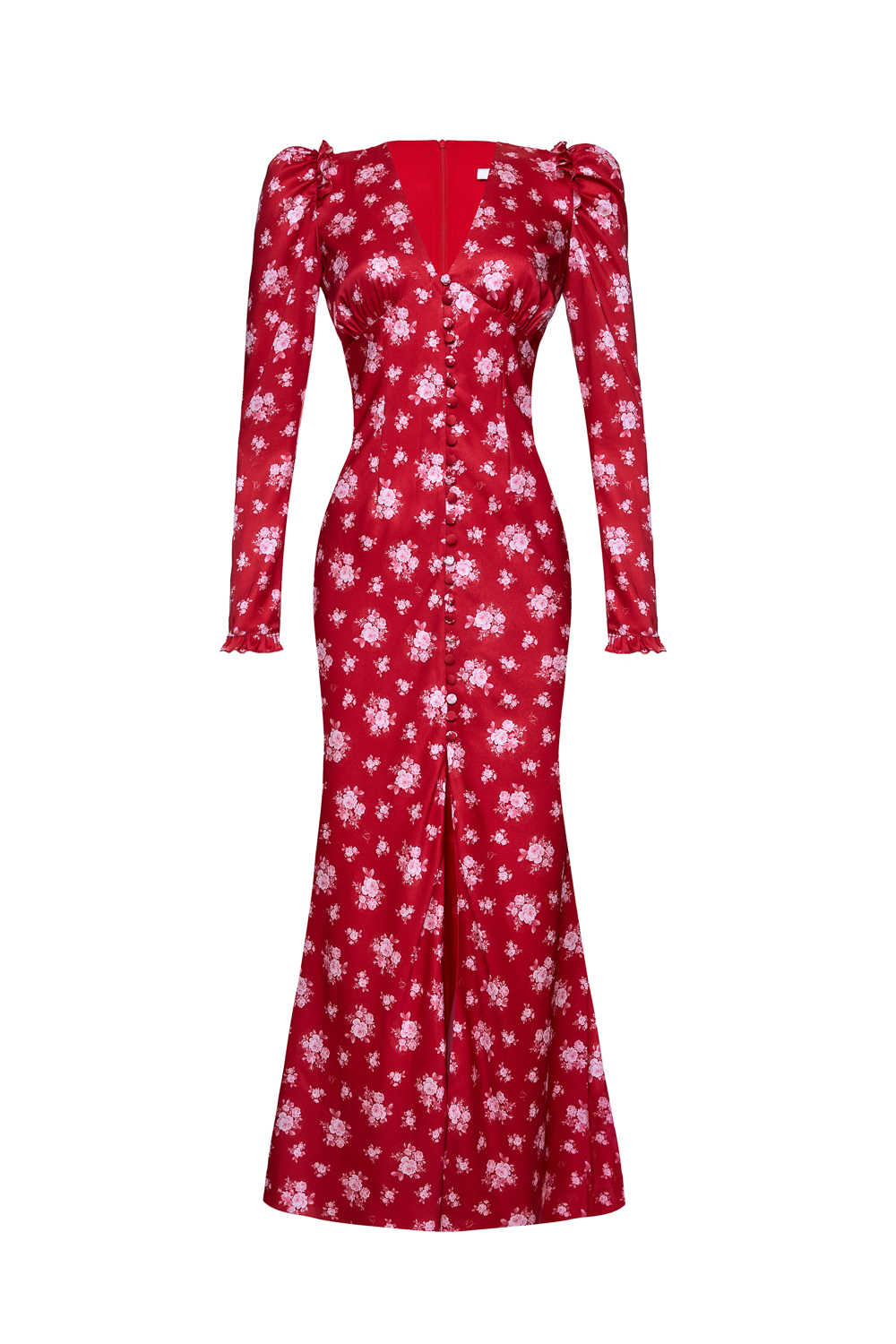 Атласное платье миди с авторским цветочным рисунком и фигурными вытачками на груди. Плечи акцентированы оборками. Застегивается на атласные пуговицы спереди и потайную молнию сзади. Длина по спинке 141 см. На модели размер S. Состав: 100% полиэстер. Подкладка: 97% полиэстер, 3% эластан.