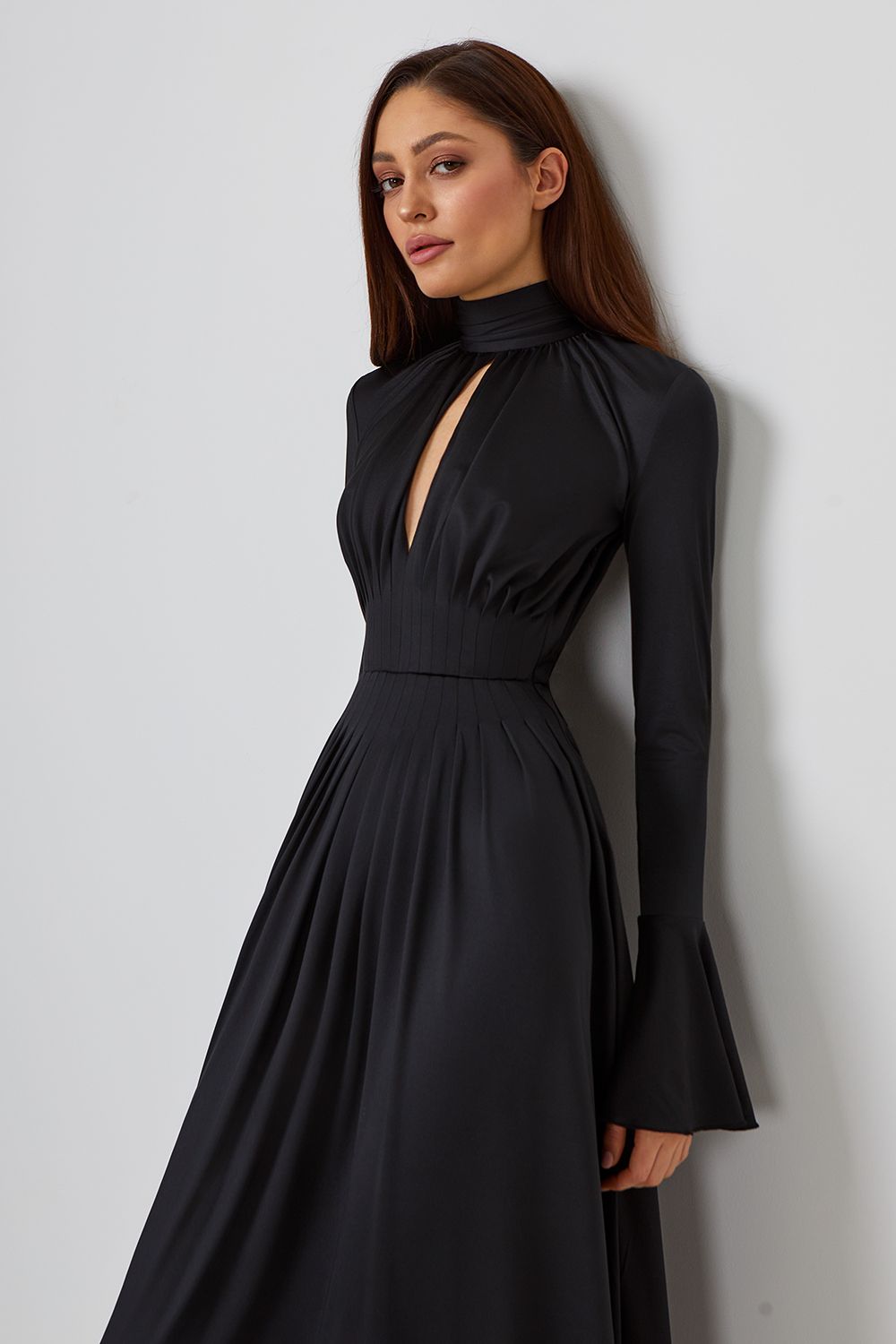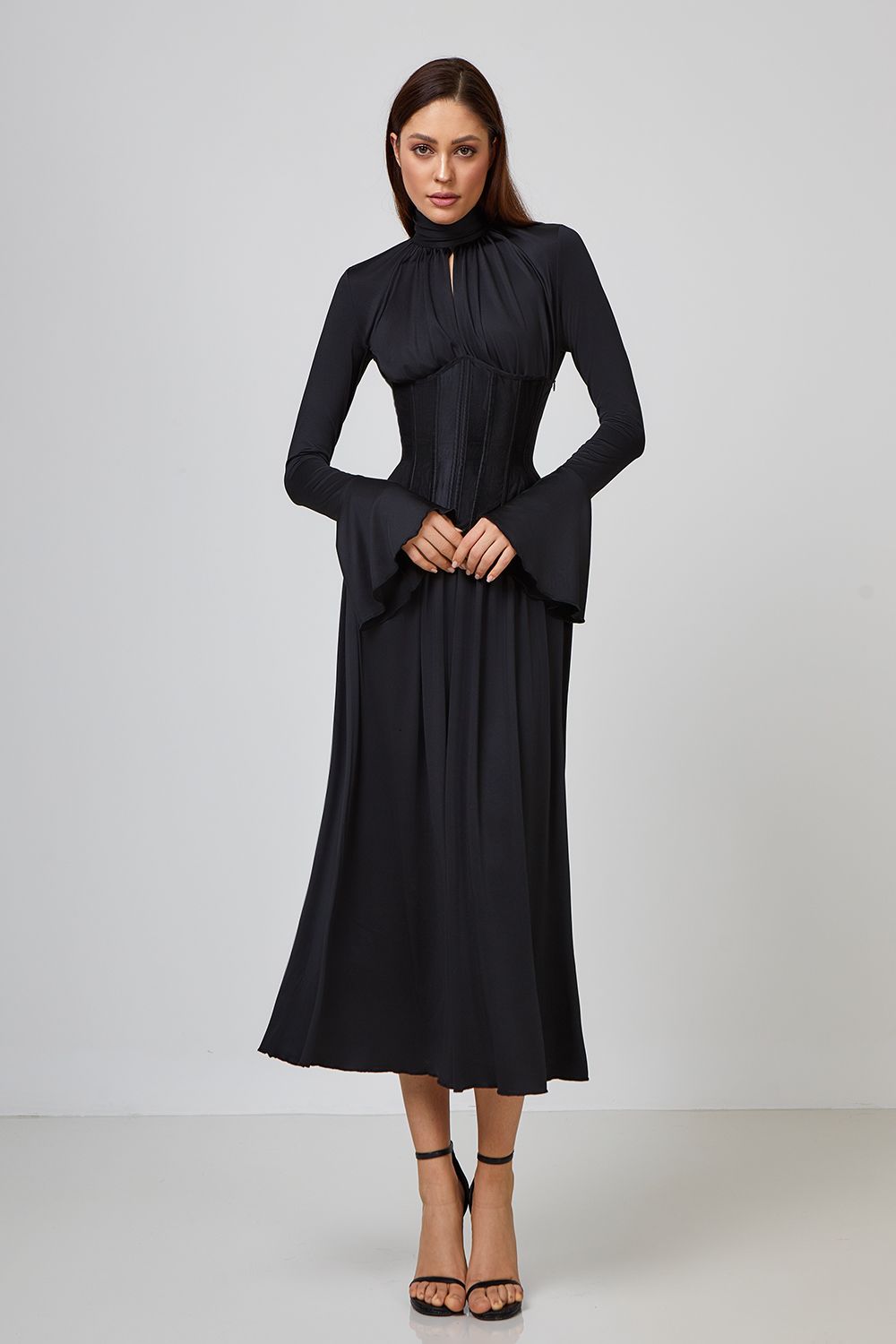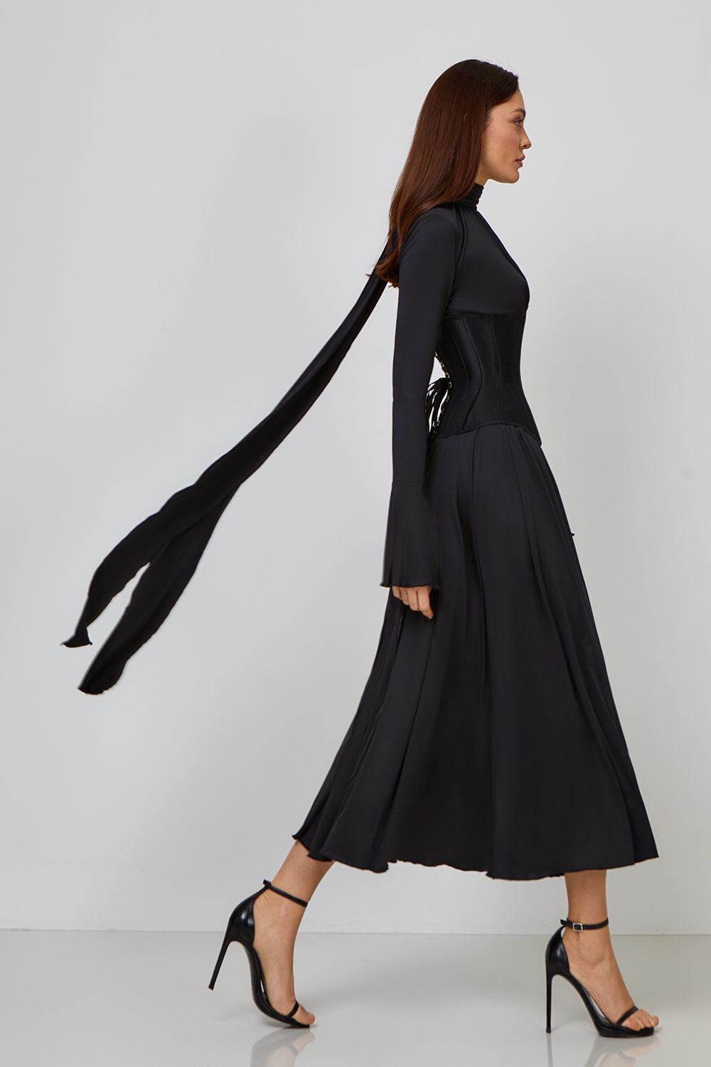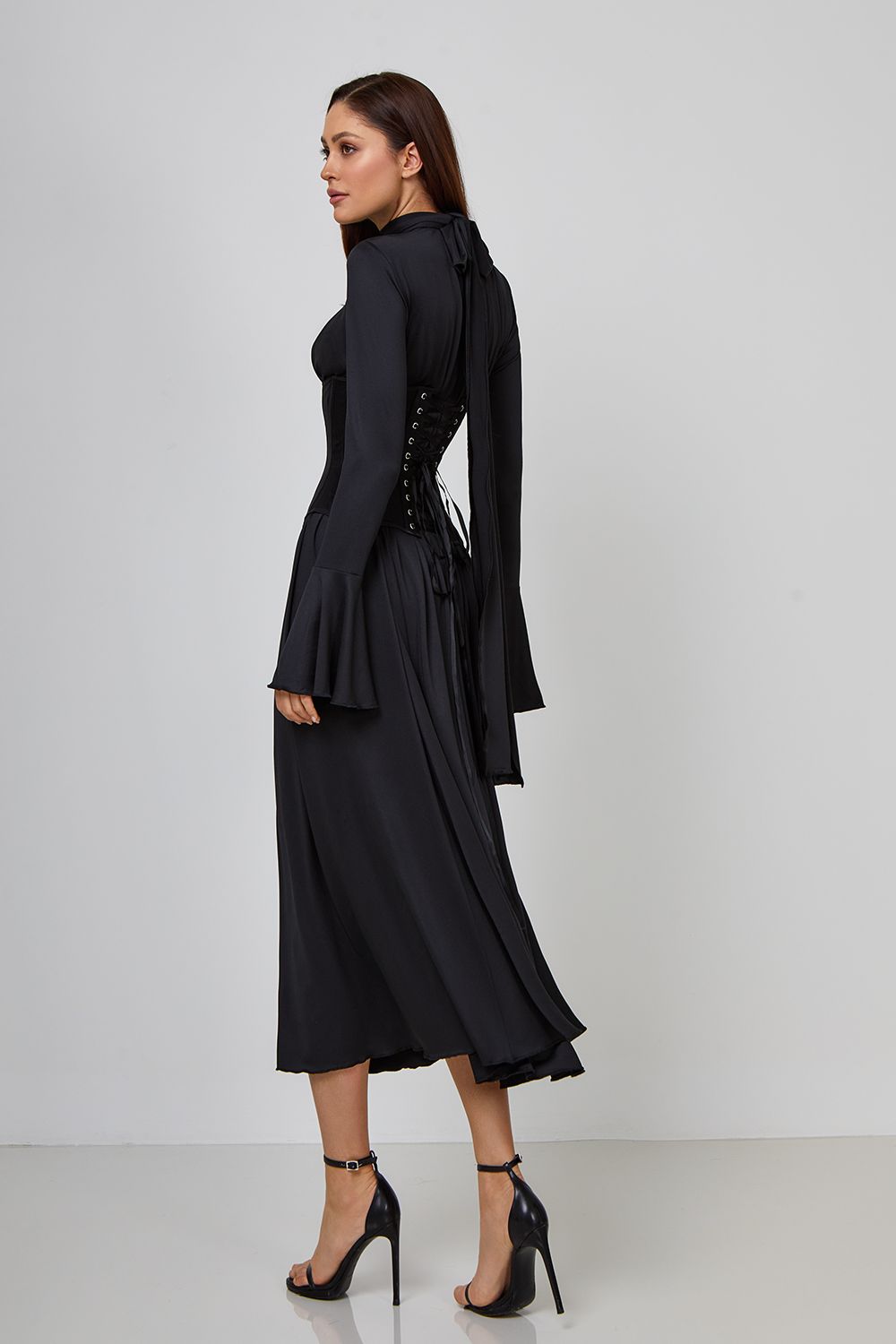 Платье-годе длины миди с овальным вырезом на груди и лентами на задней части шеи, которые можно завязать в бант. Корсет продается отдельно и идеально подойдет к платью. Артикул корсета: 25305. Длина от плеча 130 см. Состав: 92% полиэстер, 8% спандекс.