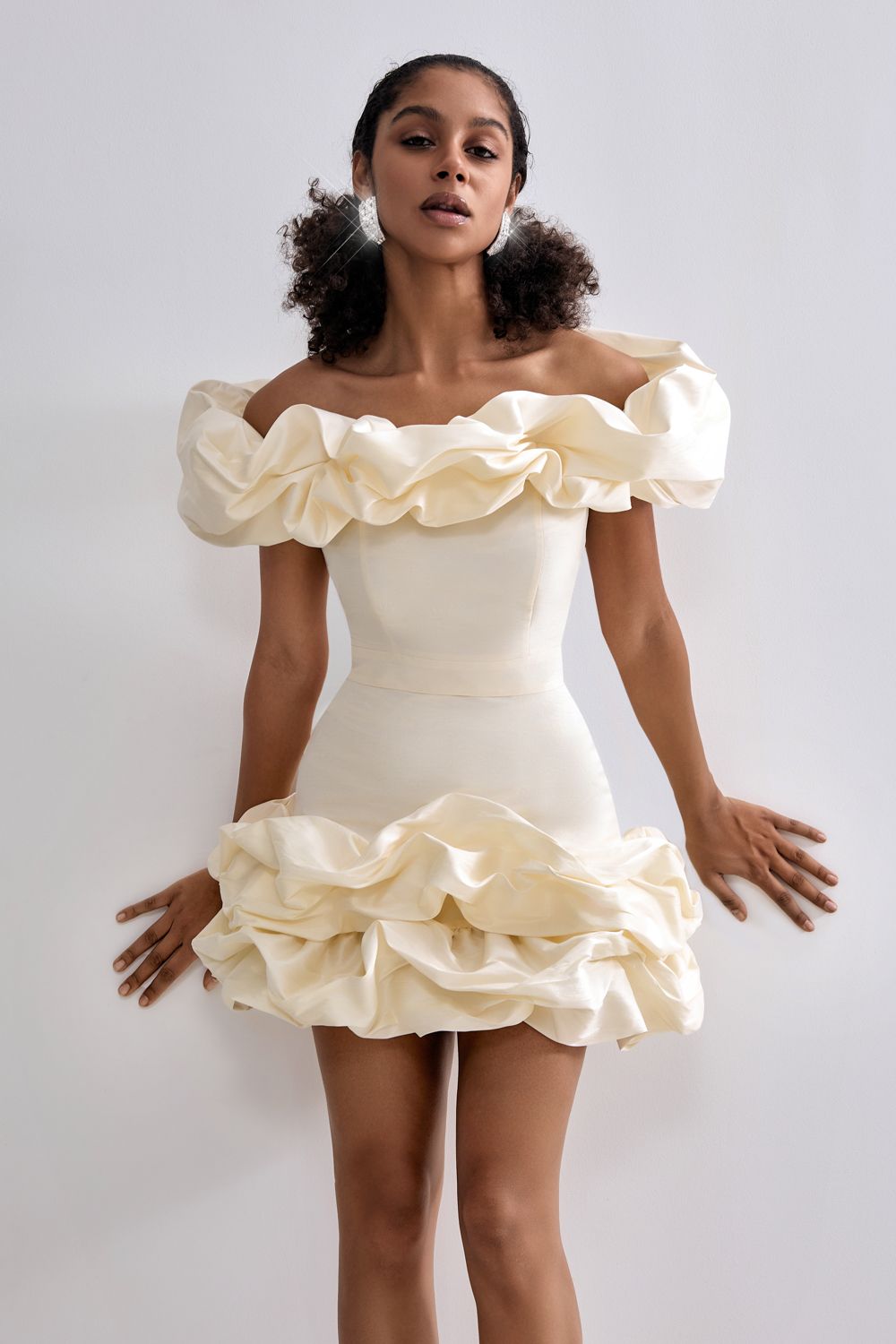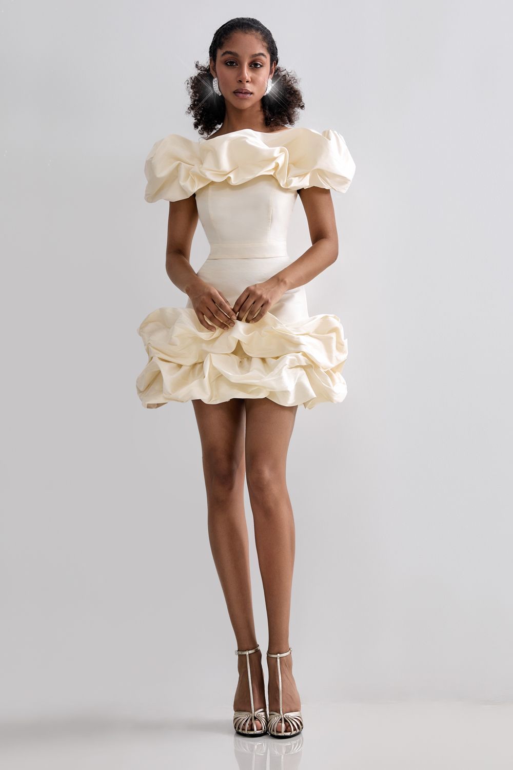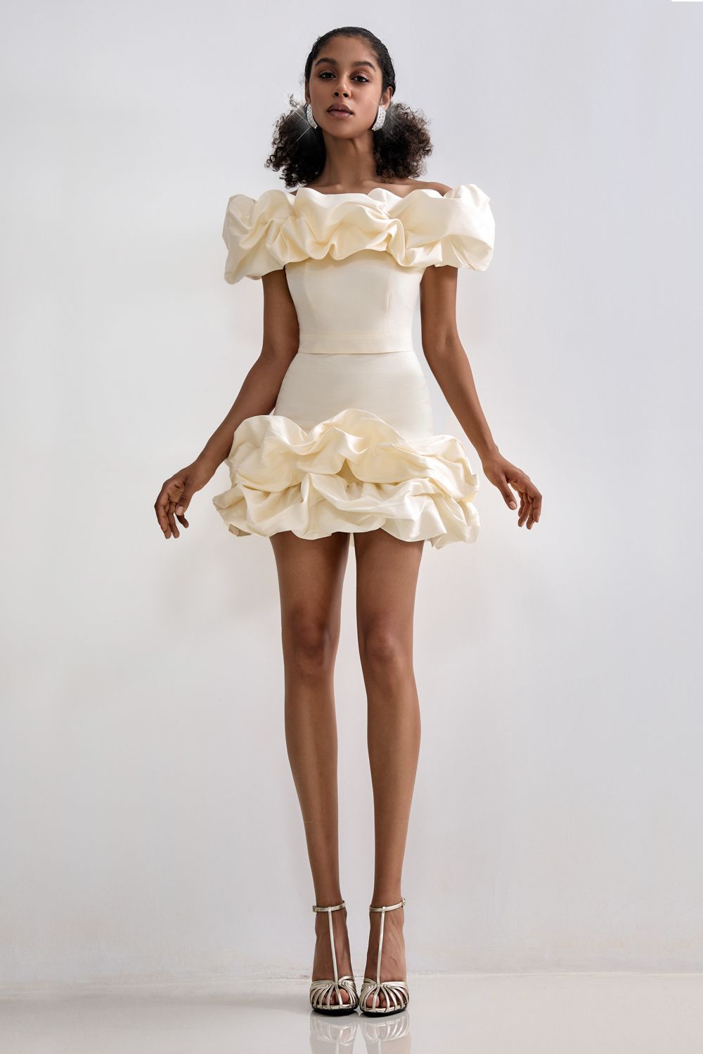 Праздничная юбка длины мини, украшенная воздушными оборками. Состав: 88% полиэстер, 12% вискоза. Подкладка: 95% полиэстер, 5% эластан.
