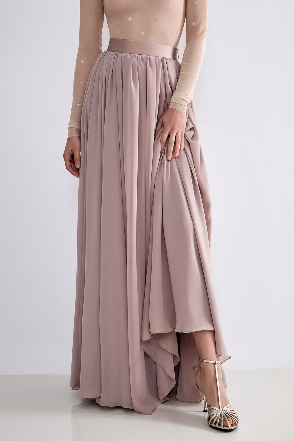 Многослойная юбка макси на атласном поясе, будет оригинально смотреться на любом мероприятии,изделие легко стилизовать и сочетать с другими предметами одежды. Длина юбки 112 см. Идеально в сочетании с боди (арт. 67770) из коллекции LN Family. Состав: 100% полиэстер. Подкладка: 100% полиэстер.