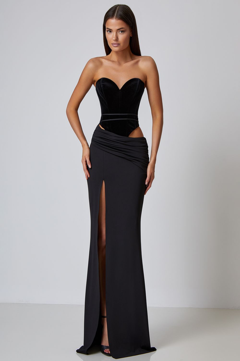 Мягкая юбка макси с заниженной линией талии, изящными ремешками и глубоким разрезом по бедру. Длина по шву 112,5 см. Состав: 92% полиэстер, 8% спандекс.