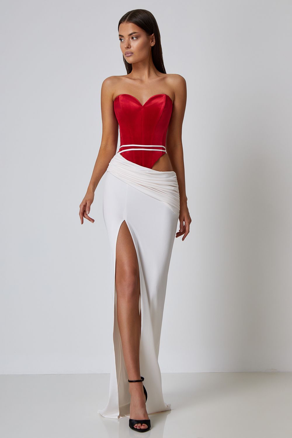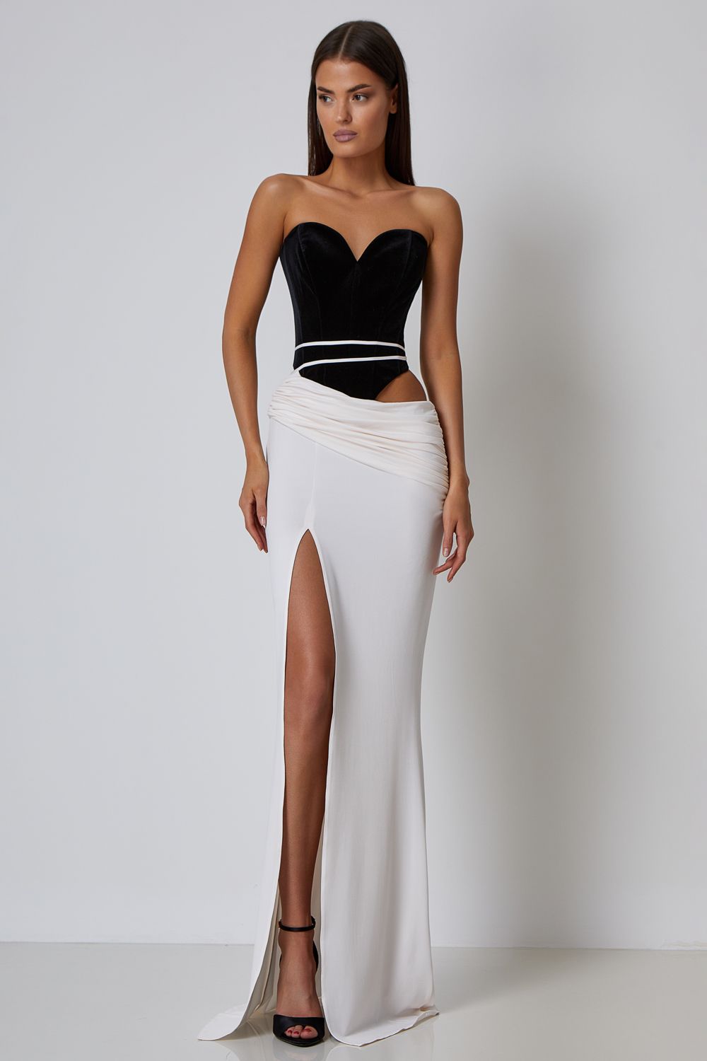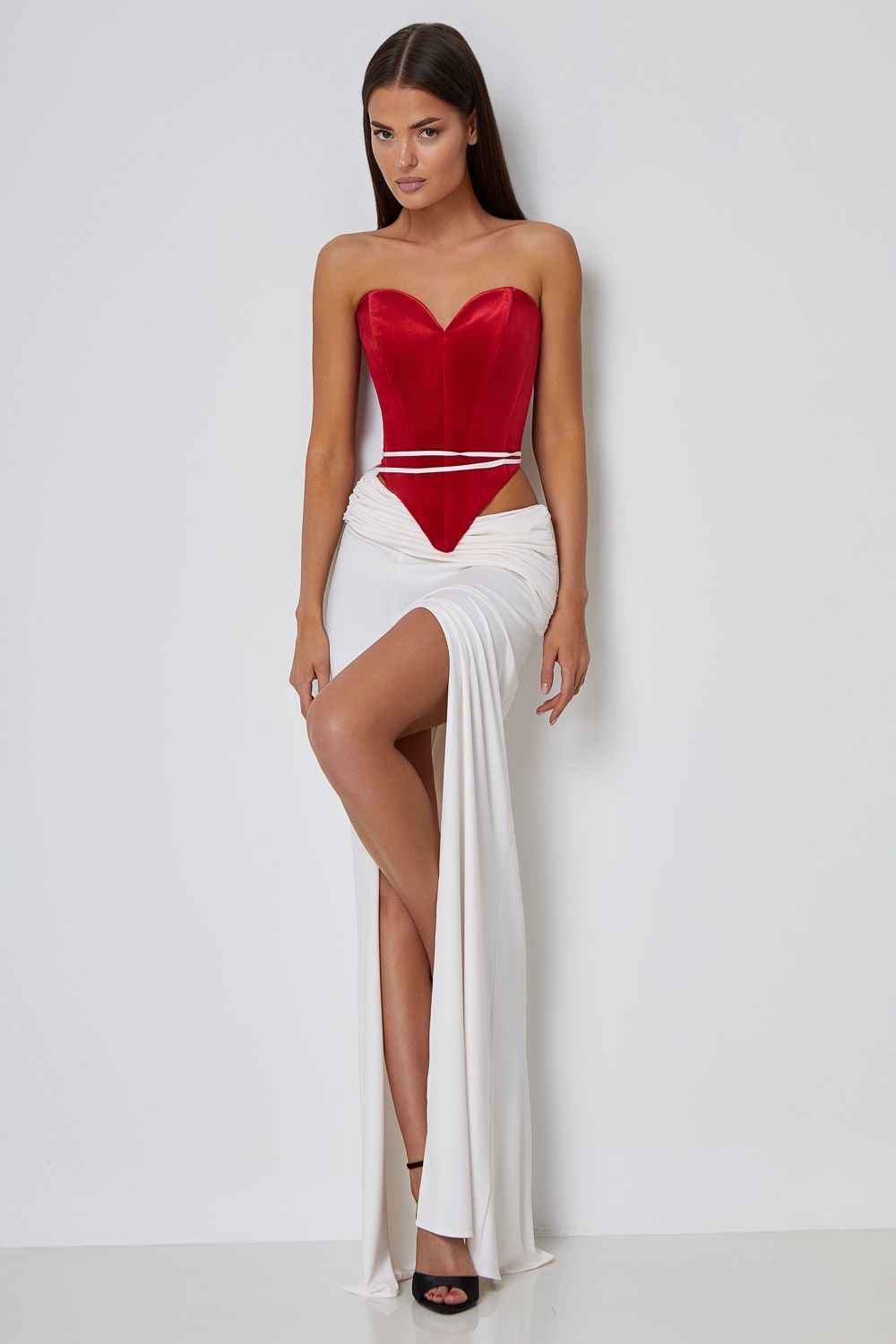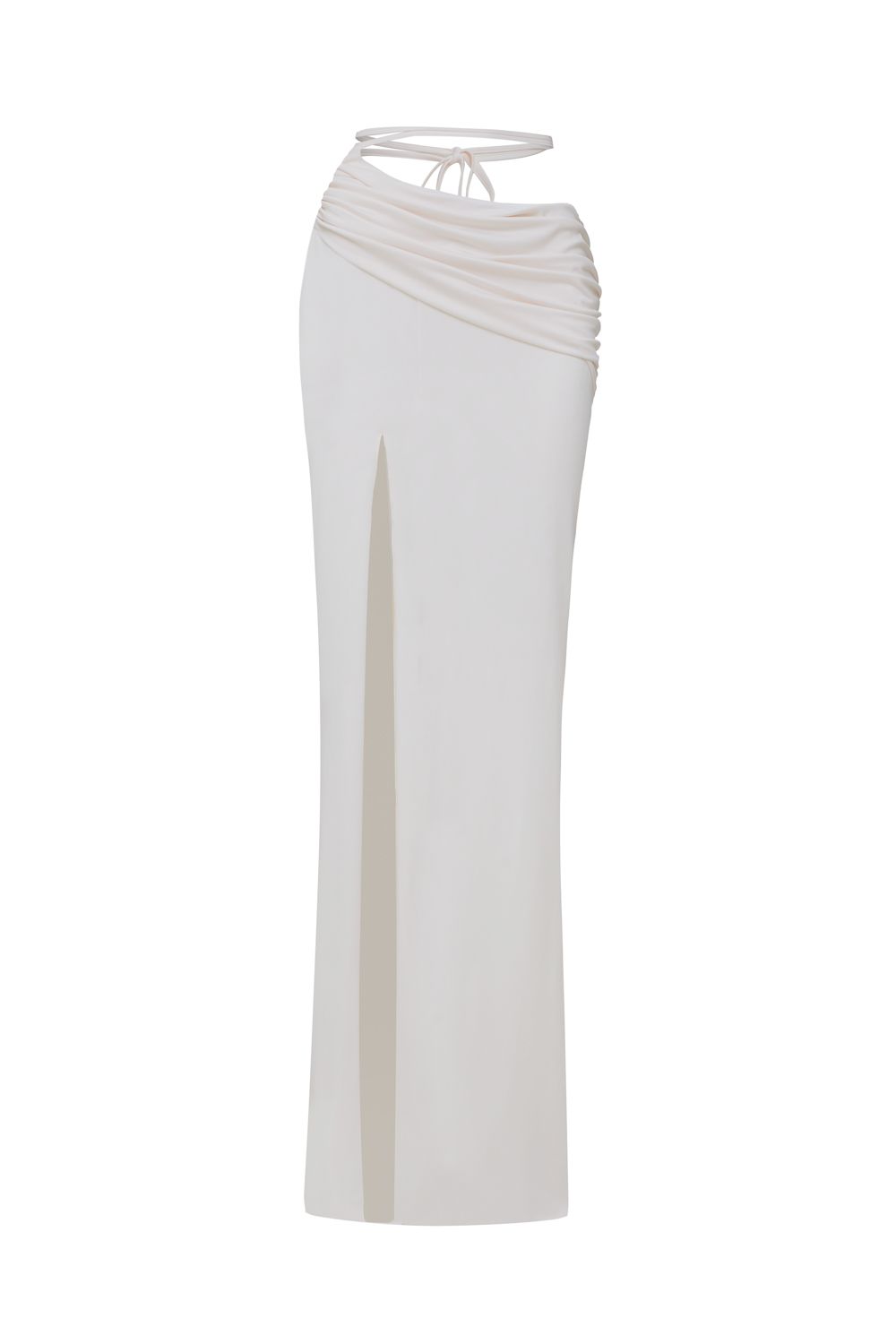Мягкая юбка макси с заниженной линией талии, изящными ремешками и глубоким разрезом по бедру. Длина по шву 112,5 см. Состав: 92% полиэстер, 8% спандекс.