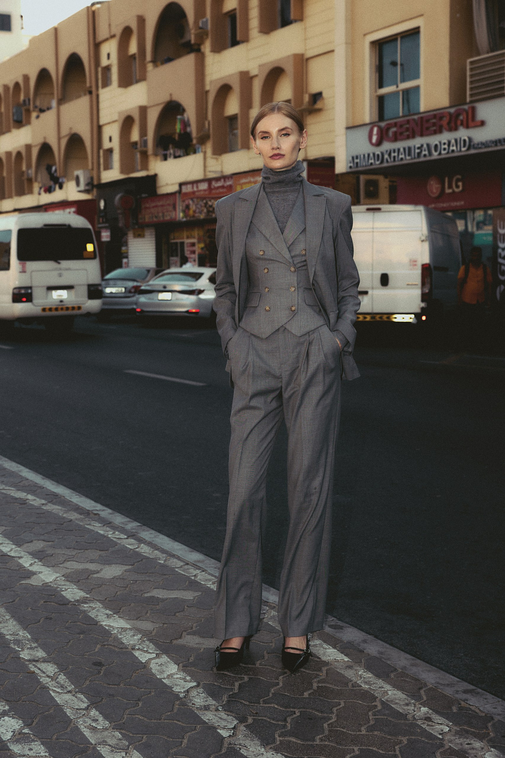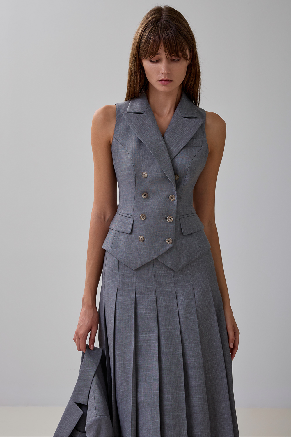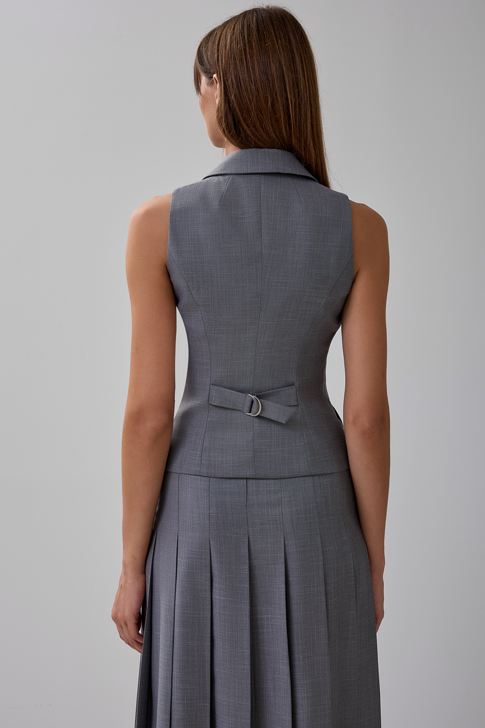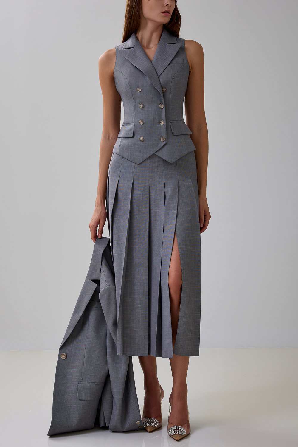 Классический двубортный жилет, застегивается на пуговицы спереди. Длина по спинке: 50 см. К жилету идеально подойдут жакет артикул: 56842, юбка артикул: 57122, брюки артикул: 56880.Состав: 56%полиэстер,30 %вискоза,14% сорона. Подкладка: 95% полиэстер, 5% эластан.