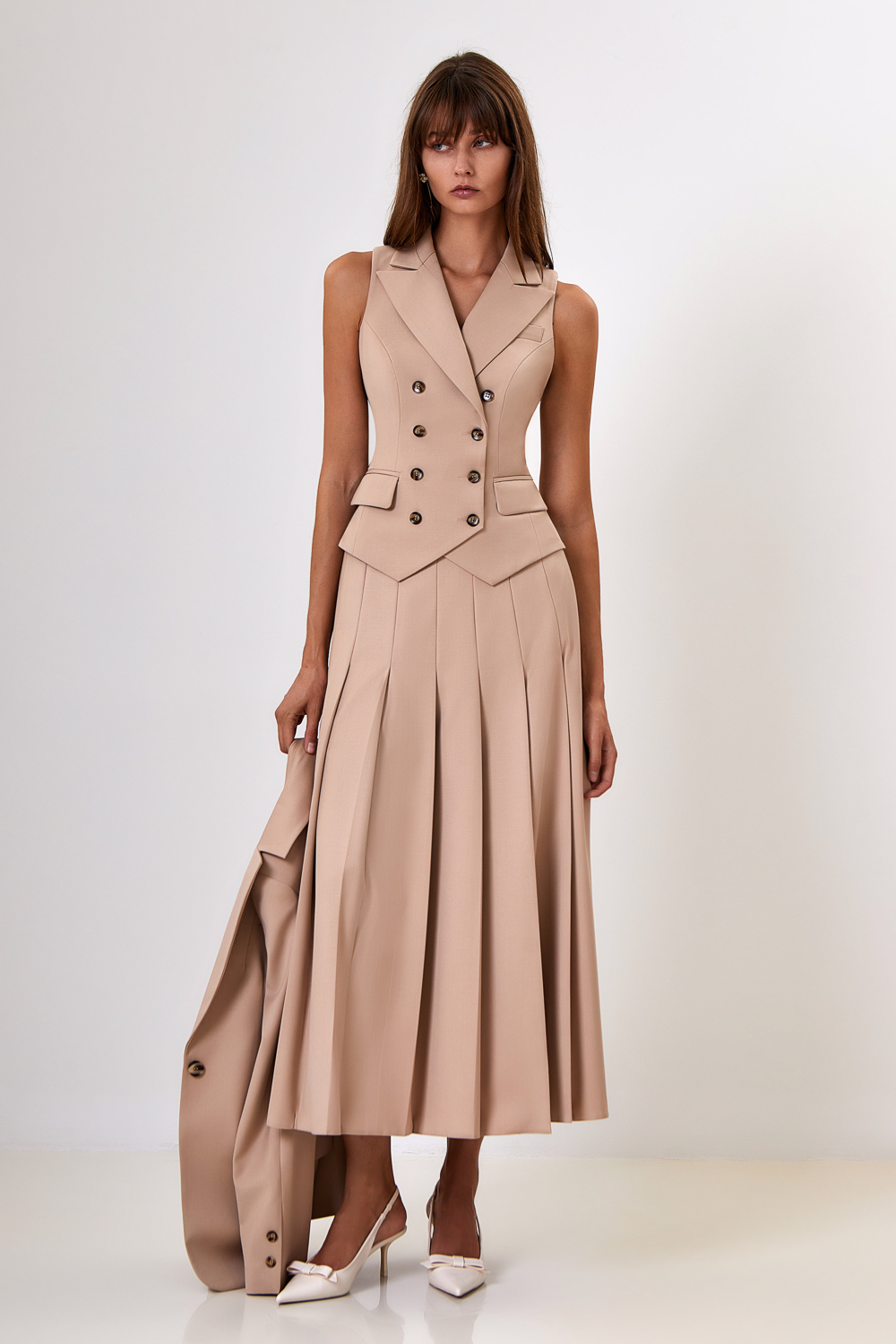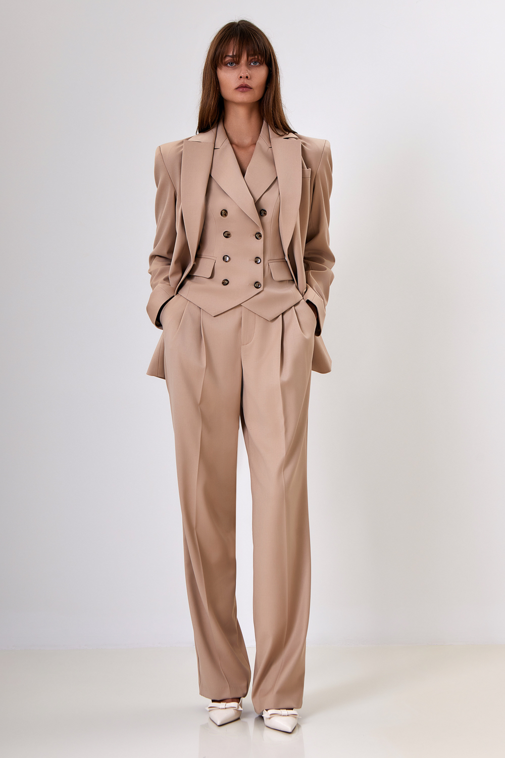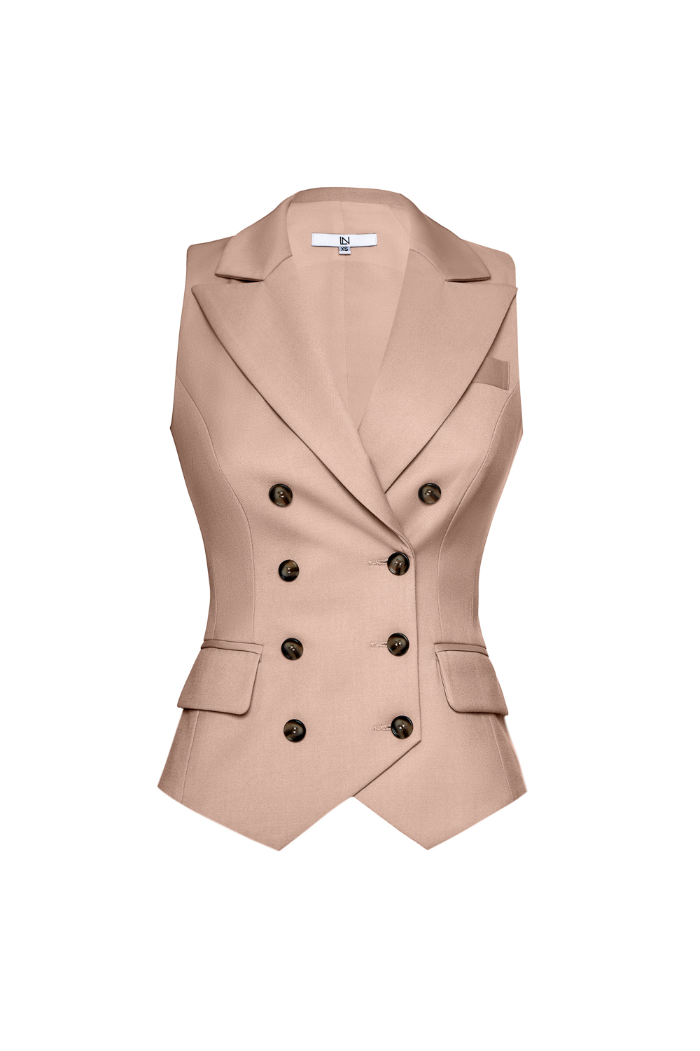 Классический двубортный жилет, застегивается на пуговицы спереди. Длина по спинке: 50 см. К жилету идеально подойдут жакет артикул: 56842, юбка артикул: 57122, брюки артикул: 56880.Состав: 56%полиэстер,30 %вискоза,14% сорона. Подкладка: 95% полиэстер, 5% эластан.